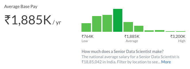As you can observe, in India, the average salary of a data scientist is approximately INR 10,00,000 per year. Whereas, the average salary for the same in the USA is a whopping $134,000 per year. (there is definitely a big gap there!)