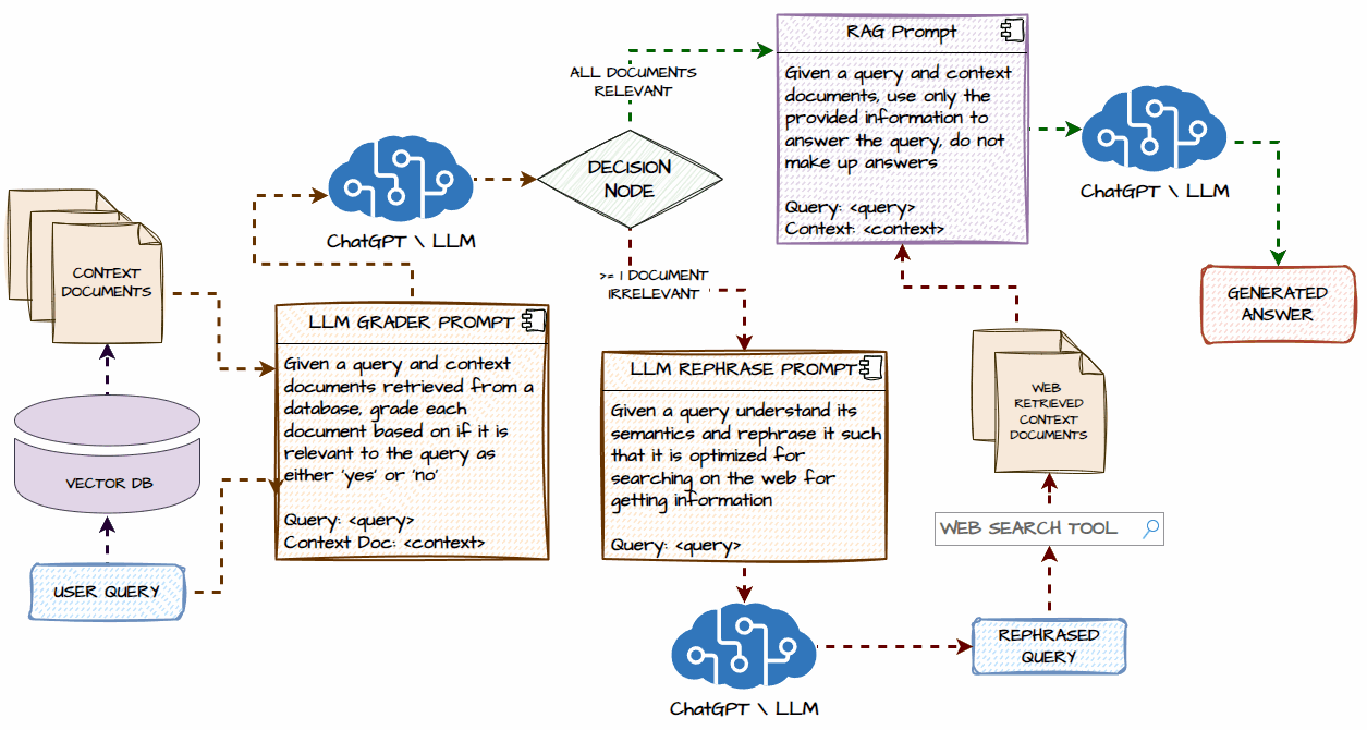 Agentic Corrective RAG draws inspiration from the paper, Corrective Retrieval Augmented Generation, Shi-Qi Yan et al. where the idea is to first do a normal retrieval from a vector database for your context documents based on a user query. Then instead of the standard RAG flow, we assess how relevant are the retrieved documents to answer the user query using an LLM-as-Judge flow and if there are some irrelevant documents or no relevant documents, we do a web search to get live information from the web for the user query before following the normal RAG flow as depicted in the following figure.