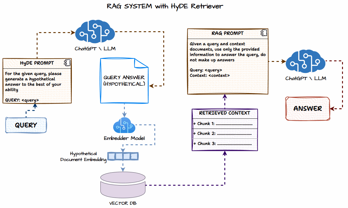 HyDE is an interesting approach where the idea is to generate a Hypothetical answer to the given question which may not be factually totally correct but would have relevant text elements which can help retrieve the more relevant documents from the vector database as compared to retrieving using just the question as depicted in the following workflow.