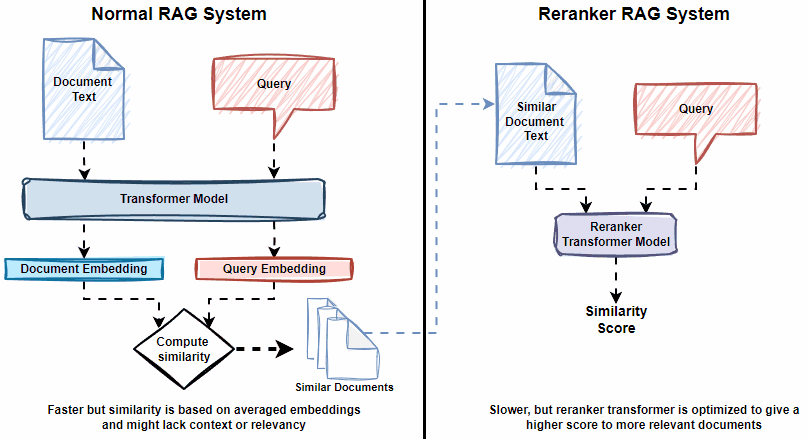 Rerankers are fine-tuned cross-encoder transformer models. These models take in a pair of documents (Query, Document) and return back a relevance score.