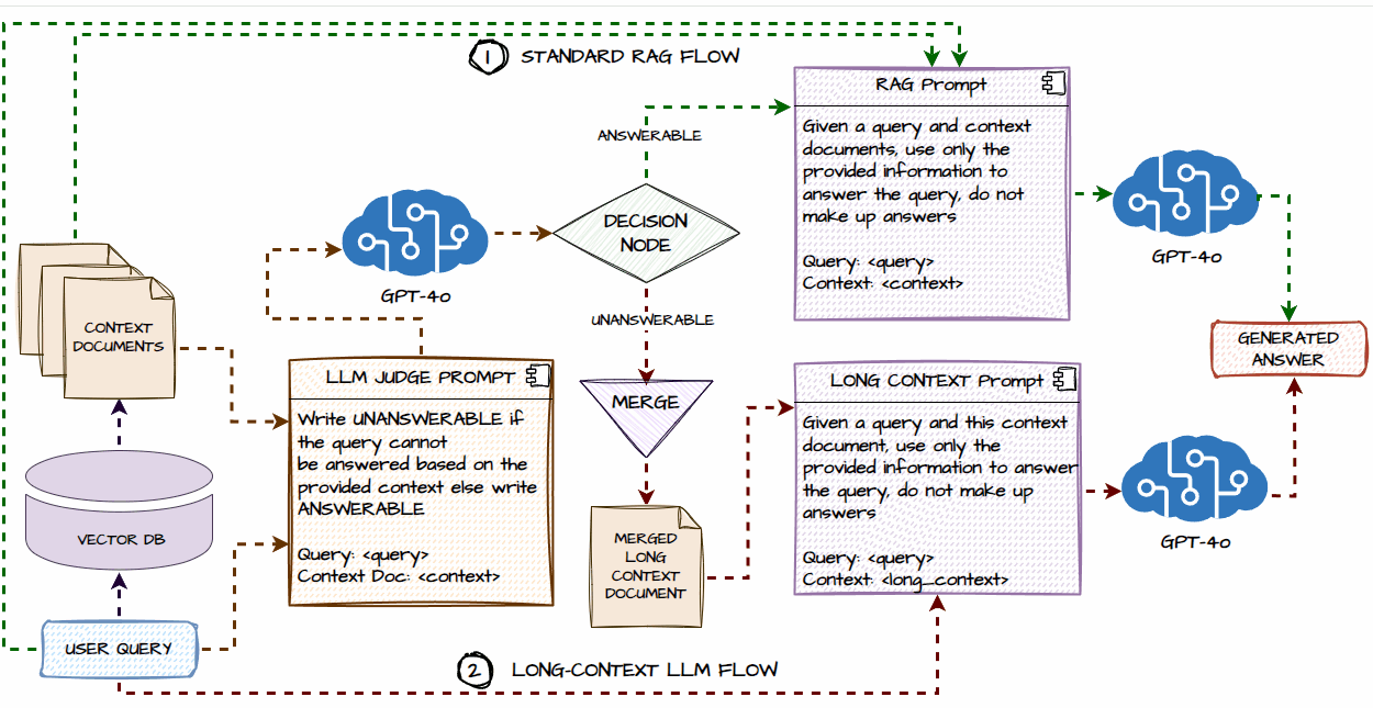 Let’s look at a practical workflow of how to implement the solution proposed in the above paper. In a standard RAG flow, the process begins with retrieving context documents from a vector database based on a user query. The RAG system then uses these documents to generate an answer while adhering to the provided information. If the answerability of the query is uncertain, an LLM judge prompt determines if the query is answerable or unanswerable based on the context. For cases where the query cannot be answered satisfactorily with the retrieved context, the system employs a long-context LLM. This LLM uses the complete context documents to provide a detailed response, ensuring that the answer is based solely on the provided information.