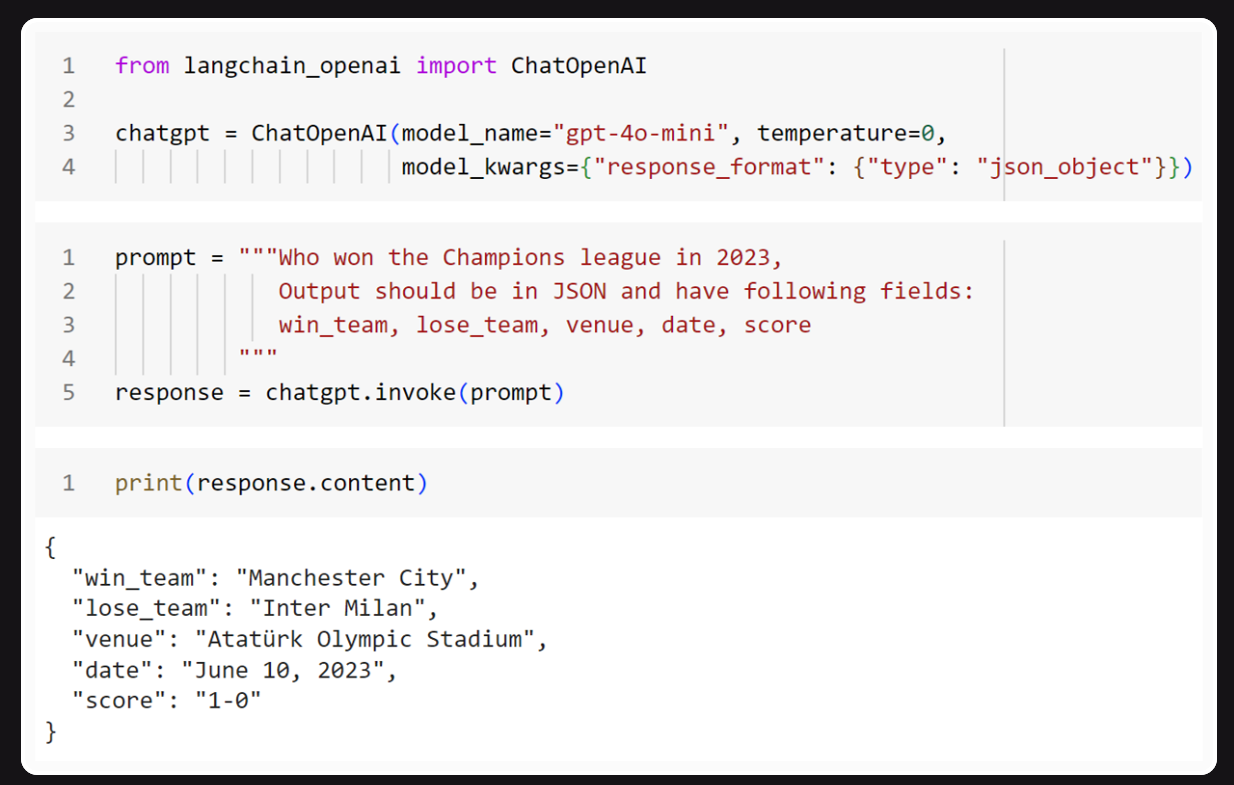 For example models like GPT-4o have native output parsing support like JSON which you can enable as shown in the following code snapshot.