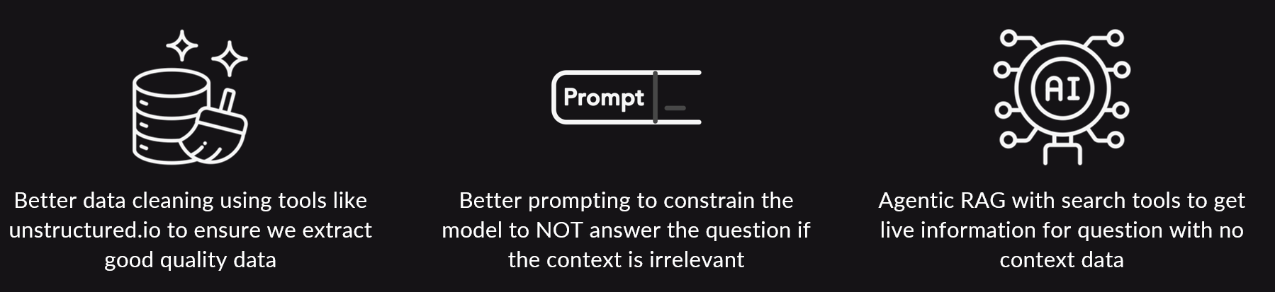 A. Solutions include better data cleaning, assertive prompting, and leveraging agentic RAG systems for live information.