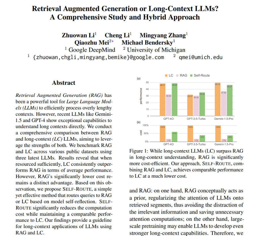 Long-context LLMs often deliver superior performance compared to Retrieval-Augmented Generation (RAG) systems due to their ability to handle really long documents and generate detailed responses without worrying about all the data pre-processing needed for RAG systems. However, they come with high computing and cost demands, making them less practical for some applications. A hybrid approach offers a solution by leveraging the strengths of both models. In this strategy, you first use a RAG system to provide a response based on the retrieved context. Then, you can employ a long-context LLM to review and refine the RAG-generated answer if needed. This method allows you to balance efficiency and cost while ensuring high-quality, detailed responses when necessary as mentioned in the paper, Retrieval Augmented Generation or Long-Context LLMs? A Comprehensive Study and Hybrid Approach, Zhuowan Li et al.