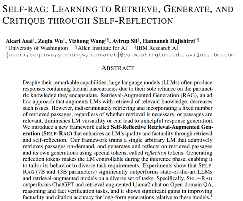 Agentic Self-Reflection RAG (SELF-RAG) introduces a novel approach that enhances large language models (LLMs) by integrating retrieval with self-reflection. This framework allows LLMs to dynamically retrieve relevant passages and reflect on their own responses using special reflection tokens, improving accuracy and adaptability. Experiments demonstrate that SELF-RAG surpasses traditional models like ChatGPT and Llama2-chat in tasks such as open-domain QA and fact verification, significantly boosting factuality and citation precision. This was proposed in the paper Self-RAG: Learning to Retrieve, Generate, and Critique through Self-Reflection, Akari Asai et al.