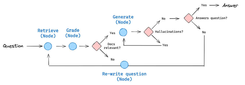 A practical implementation of this workflow is depicted in the following illustration where we do a normal RAG retrieval, then use an LLM-as-Judge grader to assess document relevant, do web searches or query rewriting and retrieval if needed to get more relevant context documents. The next step involves generating the response and again using LLM-as-Judge to reflect on the generated answer and make sure it answers the question and is not having any hallucinations.