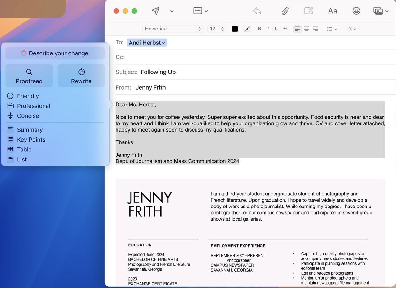 Rewrite: Craft emails, cover letters, and resumes with finesse. Apple Intelligence suggests different versions of your writing, adjusting the tone based on the audience and task.